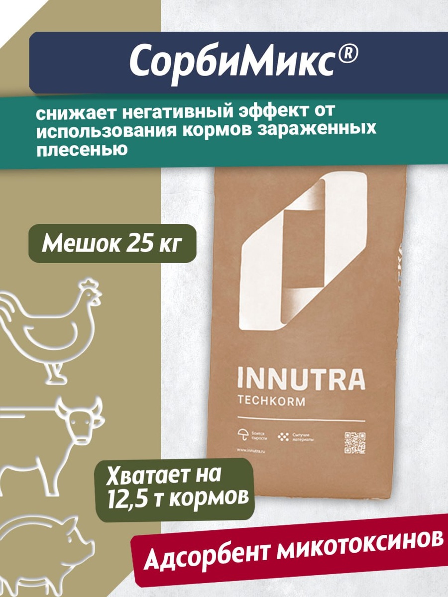 Продолжаем проблематику поднятую в опубликованном вчера видео... Делимся с вами сегодняшним полезным постом. СорбиМикс® – надёжная защита от микотоксинов! 🐄 В современном животноводстве микотоксины в кормах – это реальный риск для здоровья и продуктивности стада. СорбиМикс® не просто эффективно связывает широкий спектр микотоксинов, но и обеспечивает комплексную защиту организма. Почему выбирают СорбиМикс®? ⠀ ✅ Высокая эффективность: двухкомпонентная формула (бентонит-монтмориллонит и экстракт стенок дрожжей Saccharomyces cerevisiae) обеспечивает максимальную адсорбцию и инактивацию микотоксинов. ✅ Сохраняет питательную ценность корма: смектитовые глины связывают только токсины, не затрагивая витамины, микроэлементы и питательные вещества. ✅ Защищает кишечник: натуральные биополимеры глюкозы укрепляют стенки кишечника, не позволяя токсинам проникать в организм, и поддерживают его барьерную функцию. ✅ Стимулирует иммунитет: мощный иммуностимулятор помогает коровам справляться со