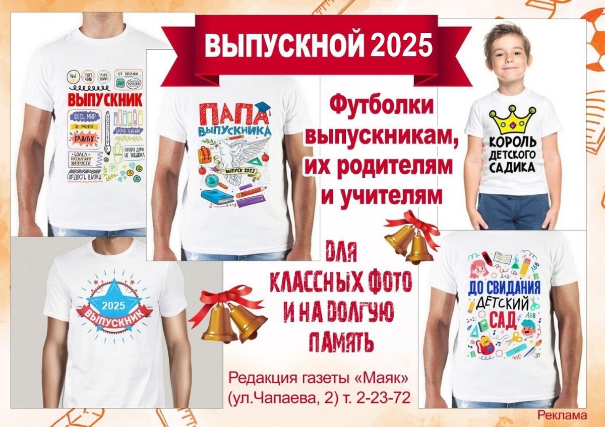 Редакция газеты "Маяк" предлагает уникальные футболки и другие сувениры с любым дизайном к выпускным! 🎓✨ Не откладывайте на завтра – подготовьтесь к этому значимому событию уже сегодня! 📞 Все подробности можно узнать, обратившись в нашу редакцию по адресу г. Котово, ул. Чапаева д.2. Мы готовы воплотить ваши идеи в жизнь! Звоните ☎️89954249201, 2-23-72 Реклама