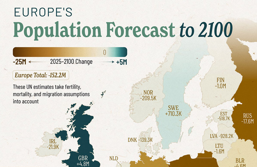 Население Европы стремительно стареет и сокращается. Согласно прогнозу ООН, опубликованному Visual Capitalist, к 2100 году большинство европейских стран столкнется с глубоким демографическим спадом. Изменится всё: от трудового рынка до налоговой политики. Кто потеряет больше всего? Какие страны справятся с вызовом? И что ждёт Европу к концу XXI века? Худший прогноз — у Украины: ожидается, что численность её населения сократится на 61%. В десятке «антилидеров» — Албания, Литва, Босния и Герцеговина, Беларусь, Северная Македония, Латвия, Молдова, Польша, Болгария и Румыния. Все они рискуют потерять от 40% до 57% своего населения. Причины — старение, отток молодёжи в более благополучные страны ЕС и низкая рождаемость. Миграция в поисках лучшей жизни стала постоянной реальностью для целых поколений жителей этих стран. Даже крупнейшие экономики Европы не избежали потерь. Германия, по прогнозам, потеряет 13,8 миллиона человек, Польша — почти 19 миллионов, Италия — свыше 23 миллионов. Причём