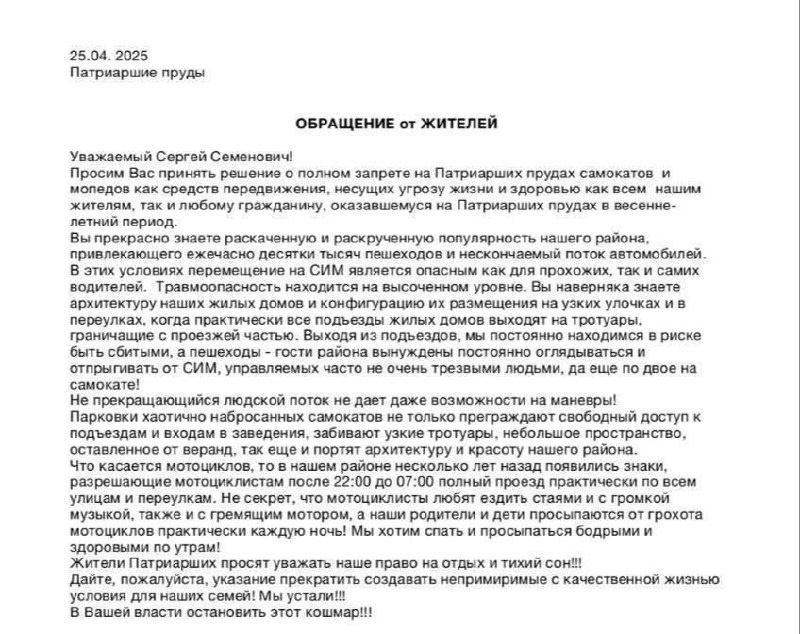 Даже жители Патриков не выдерживают))) Жители Патриарших прудов начали сбор подписей под обращением к Собянину с просьбой полностью запретить самокаты и мопеды на территории района с 21:00 до 8:00. По словам жителей района, регулярные скопления самокатов перекрывают прохожую часть и входы в подъезды жилых домов, магазины и рестораны. Из-за ночных заездов и сильного шума мопедов жители не могут спать. Жители сообщают, что сбор подписей продолжится до середины мая, после чего обращение будет передано в приемную мэрии.