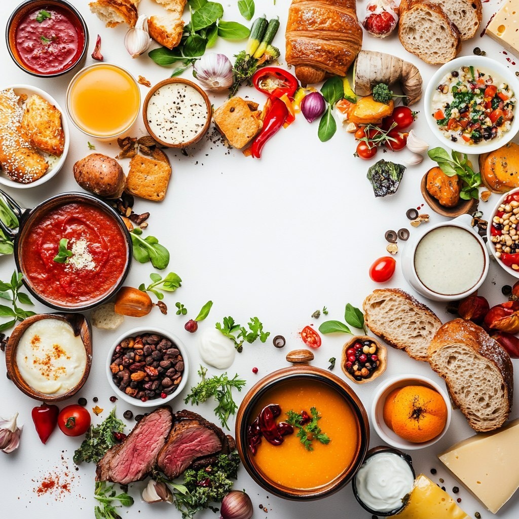 Создано на основе запроса: white background with a bored or food items, bowls of soup with vegetables, herbs, garlic, chilli scattered around, fruit smoothies with fruits scatted around, items like bread, cheese, chicken, steak, doughnut, croissants throughout ar 16:9 --- Автоперевод: Белый фон с скучными или продуктами питания, мисками супа с овощами, травами, чесноком, чили, разбросанными вокруг, фруктовые смузи с фруктами, такими как хлеб, сыр, курица, стейк, пончик, круассаны по всему Ар 16: 9 Что скажешь? 🤔 https://dzen.ru/id/65c0c65c86e4f837c27b24d7 #ИИ #AI #нейросеть #midjourney #art