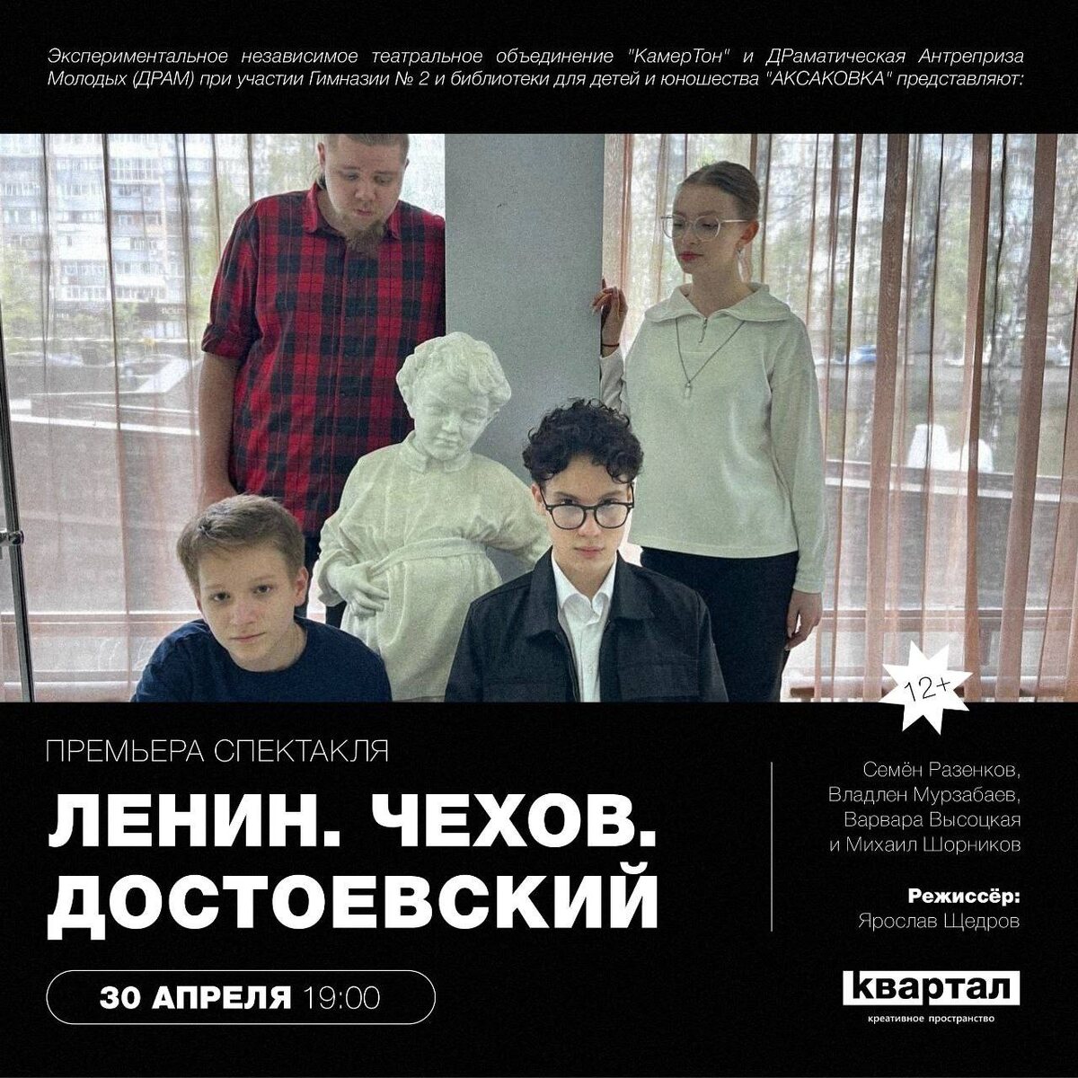 Экспериментальное независимое театральное объединение "КамерТон" и ДРаматическая Антреприза Молодых (ДРАМ) при участии Гимназии № 2 и библиотеки для детей и юношества "АКСАКОВКА" представляют: Спектакль "ЛЕНИН. ЧЕХОВ. ДОСТОЕВСКИЙ" | 12+ 🗓️ 30 апреля, 19.00 📍Квартал, Ленина 78 ИГРА В ЧТЕНИЕ Библиотека. Наши дни. Герои произведений Чехова, Достоевского и примкнувшего к ним Гарина-Михайловского встречаются в сознании главных героев -подростков и молодых людей - с детскими рассказами о юном Ульянове-Ленине и его старшем брате Александре. Персонажи спасают близких, радуются первому успеху и даже "умирают", чтобы прийти к пониманию того, что для Человека важно оставить после себя След в жизни. И того, каким должен быть этот След. 🏷️ свободные взносы #30апреля25