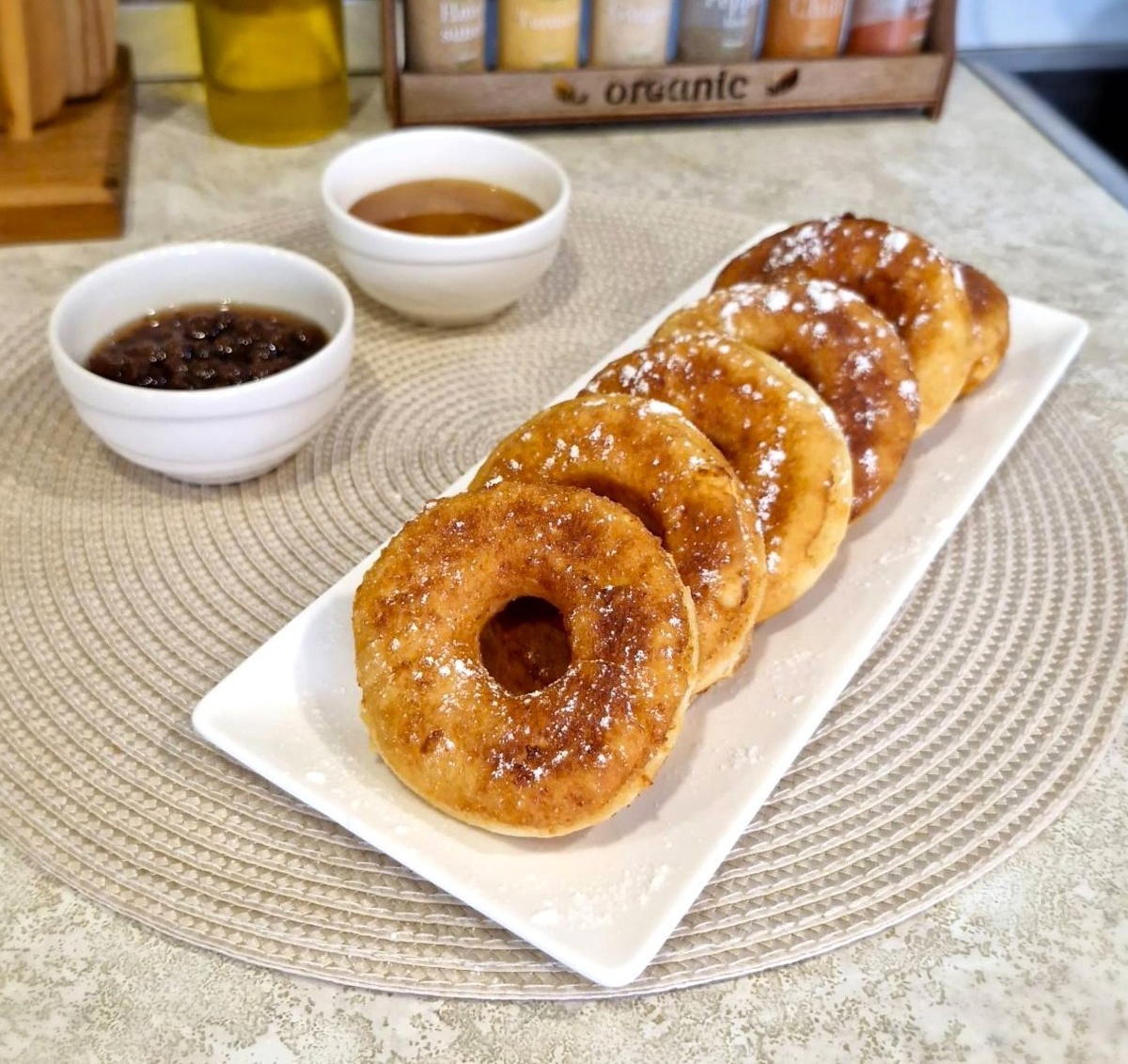 Калачи обжариваем на среднем огне на достаточном количестве растительного масла примерно по 3 минуты с каждой стороны, даем немного остыть и присыпаем сахарной пудрой.