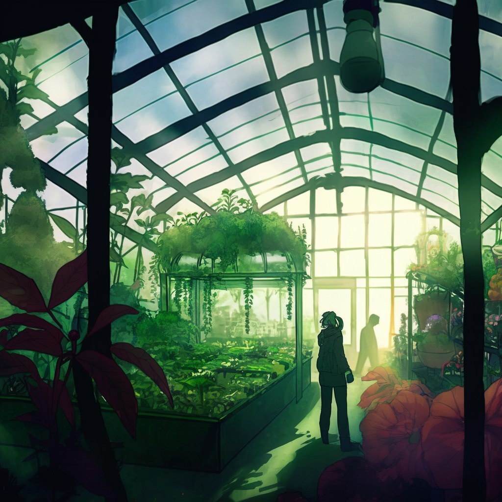 Создано на основе запроса: garden, plants, growing vibes, grower humans silhouettes, agro museum, hyper realistic