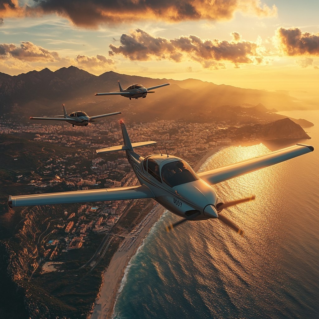 Создано на основе запроса: small aircraft flying over the Spanish coast during golden hour, group of light planes in formation, view of