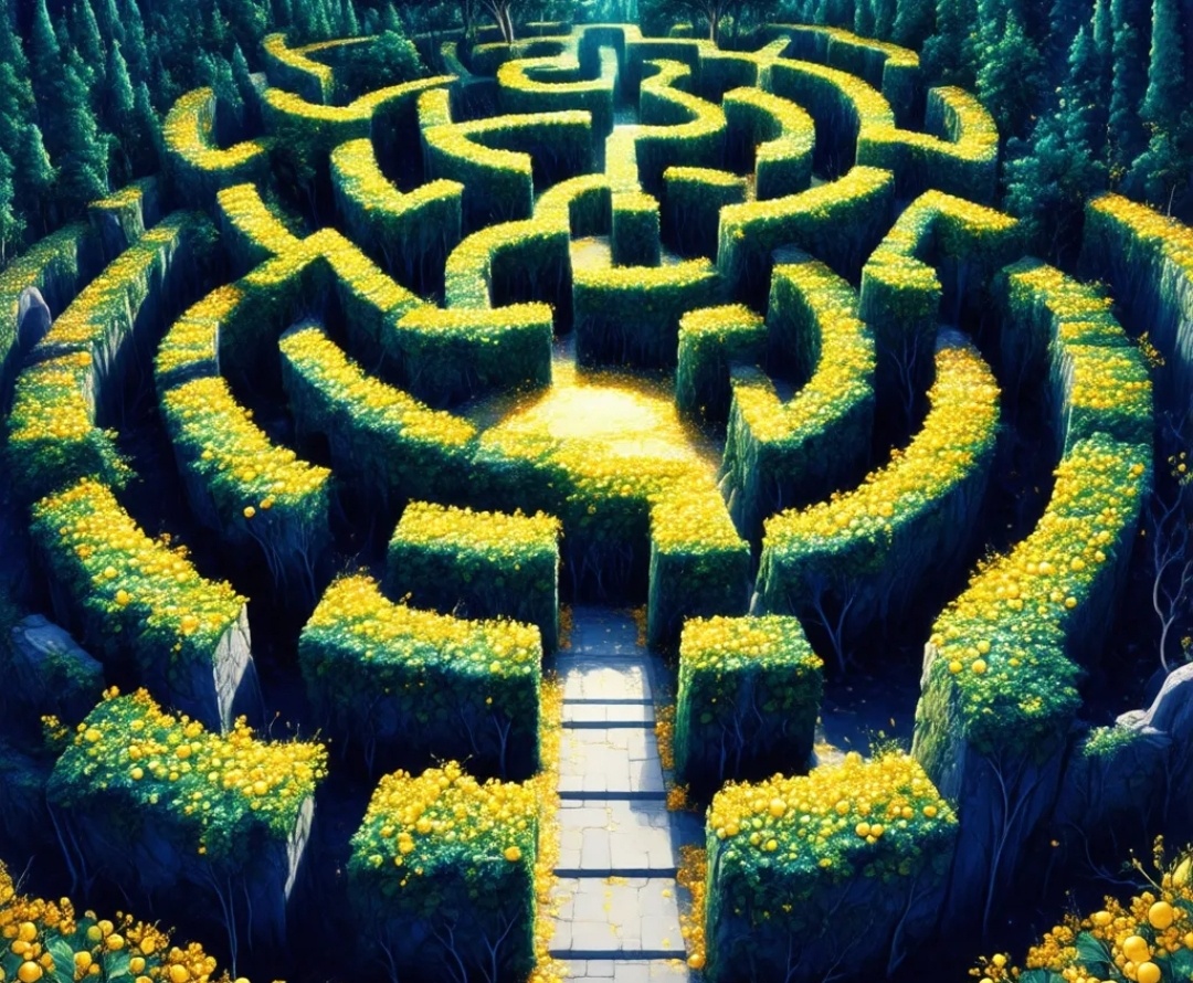 Однажды утром, следуя странному ощущению, Илья отправился к западной части сада — туда, где ранее не был. Воздух там был густым, будто бы он находился между мирами. Там он увидел лабиринт — не каменных стен, а густых лоз, оплетённых в причудливые формы. Они были живыми. Они дышали. Отводили взгляды. На самом входе — надпись: "Только тот, кто идёт без страха, найдёт истину." Илья шагнул внутрь. Сразу воздух стал тяжёлым. Он видел два пути. Один — широкий, безопасный, но темный. Второй — узкий, но сияющий. Он выбрал второй. Внутри лабиринта росли золотые ягоды, которые можно было сорвать только с вопросом о себе. Каждая ягода содержала знание. Одна — показала его прошлое. Вторая — настоящее. Третья — возможность выбора. — Почему ты здесь? — услышал он, собирая последнюю ягоду. — Я хочу знать… — начал он, но замолчал. — Тогда повтори вопрос. На выходе его ждал не Минотавр — а его собственное отражение. Мужчина в грязной одежде, с кожей, покрытой шрамами. Он понял: каждый лабиринт — это п