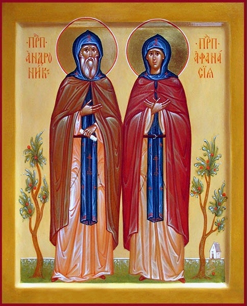 Он был богатым торговцем золотом в Антиохии; она — его женой. Оба были набожными людьми и делились своим богатством с церковью и бедняками. По воскресеньям, понедельникам, средам и пятницам Андроник мыл и ухаживал за бедными мужчинами; а Афанасия делала тоже самое с бедными женщинами. Однажды двое их детей заболели. Андроник пошёл в святилище святого Иулиана, чтобы помолиться за них, но когда он вернулся домой, дети были уже мертвы. Афанасии было видение святого Иустина Мученика, в котором он передал женщине монашеское одеяние. После чего, супруги отдали всё своё имущество церкви и отправились в Александрию. Где у святилища святого Мины они разошлись. Он присоединился к монастырю аввы Даниила в Ските; а она — к женскому монастырю в Тавенниси. Двенадцать лет спустя Андроник решил отправиться в паломничество в Иерусалим. Там он встретил монаха по имени Афанасий, который на самом деле был Афанасией. Из-за опасностей путешествия в облике женщины она переоделась мужчиной. Годы аске