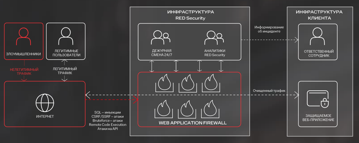 Сервис RED Security WAF защищает от разных типов атак: атак на API, OWASP TOP-10, 0-day, 1-day и DDoS уровня приложений. Сначала команда сервиса настраивает правила мониторинга и фильтрации трафика для защищаемого веб-ресурса, затем система осуществляет круглосуточное выявление и блокировку аномалий в трафике, а аналитики сервиса – разбор подозрительной активности.