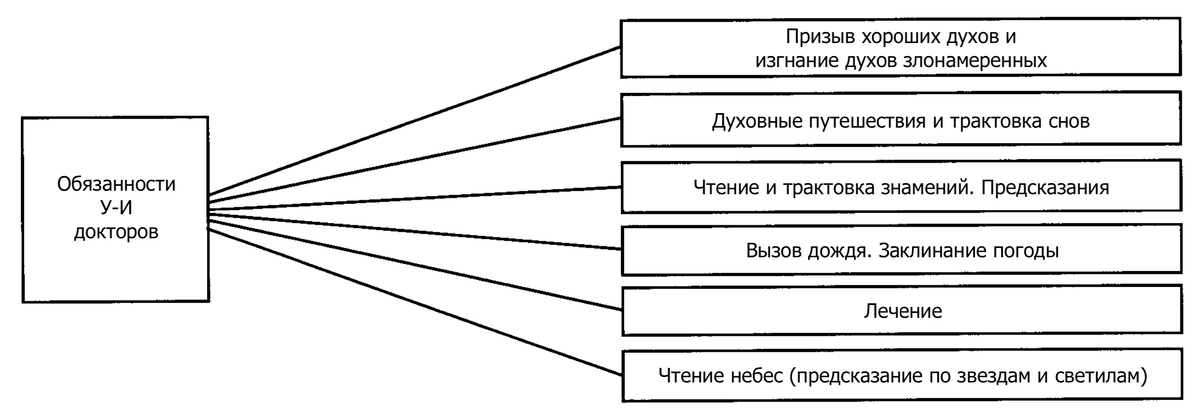 • Доктор У-И должен был совершать духовные путешествия в небесные сферы космоса и общаться с божествами и бессмертными, обитающими в созвездиях. В других случаях путешествие доктора У-И в духовный мир требовало от него спуститься под землю и проникнуть в подземный мир, чтобы спасти души умерших, похищенные злыми духами. Совершались особые обряды, чтобы освободить похищенные души от негативных влияний, которые заманили их в ловушку, а также поддержать и провести через "Небесные врата жизни".