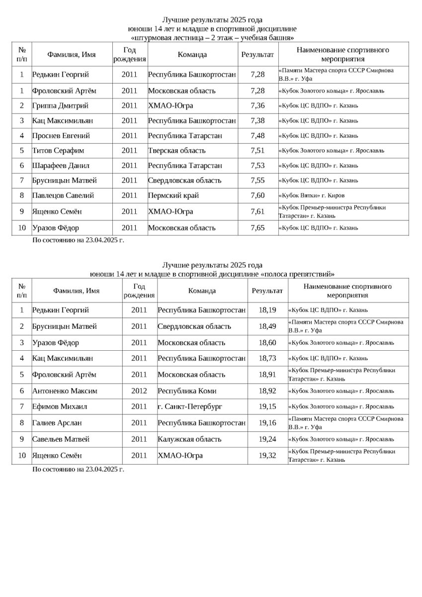 Лучшие результаты 2025 года ⚡️ Юноши 14 лет и младше (по состоянию на 23.04.2025) Обновление после соревнований: «Кубок Золотого кольца» 🏳 г. Ярославль «Кубок К.Э. Циолковского» 🏳 г. Калуга «Кубок Победы» 🏳 г. Волгоград «Штурмовая лестница – 2 этаж – учебная башня»: 1. Редькин Георгий 🏳 Р. Башкортостан 7,28 сек. 2. Фроловский Артём 🏳 Московская обл. 7,28 сек. 3. Гриппа Дмитрий 🏳 ХМАО-Югра 7,36 сек. «Полоса препятствий»: 1. Редькин Георгий 🏳 Р. Башкортостан 18,19 сек. 2. Брусницын Матвей 🏳 Свердловская обл. 18,49 сек. 3. Уразов Фёдор 🏳 Московская обл. 18,60 сек. 📝 Подготовил ЗТР Фроловский А.А.