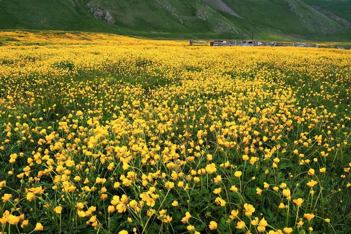 Океан лютиков. Вы любите море? Я и горы люблю, и к морю неравнодушен. Буквально позавчера и 4 дня назад купался в Чёрном море. 2 заплыва минутных и 3. Вода 12 градусов, пасмурно, а позавчера ещё и дождь мелкий моросил, но желание ощутить воду победило здравый смысл :) А сейчас я снова в горах и вспомнилось мне море лютиков. Середина июня, пасмурно, временами идёт лёгкий дождь, скорее приятный, чем досаждающий. И всё в жёлтом цвете. Так цветут горы. Примерно так поляна должна выглядеть и во время тура Эльбрусский Квадрант СЗ - даты совпадают. И наш путь будет лежать прямо через эти поляны жёлтого буйства природы.