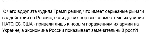 С чего вдруг эта чудила Трамп решил, что имеет серьезные рычаги воздействия на Россию, если до сих пор все совместные их усилия - НАТО, ЕС, США - привели лишь к новым поражениям их армии на Украине, а экономика России показывает замечательный рост?!