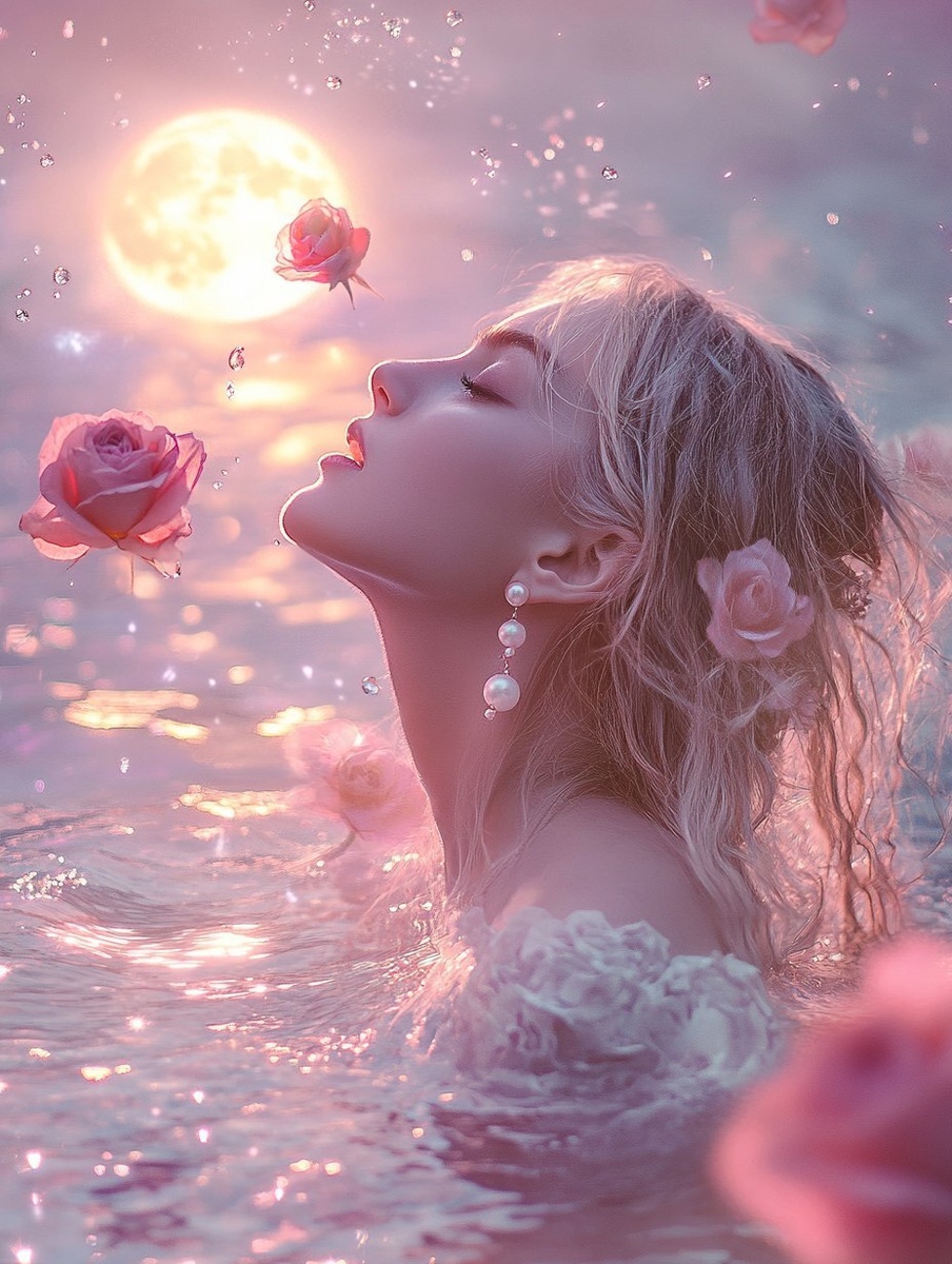 Создано на основе запроса: Soft pastel colors, under a shining full moon, a dreamy scene. A woman with soft golden blonde hair stands in a wide expanse of water, singing, pearl earrings. From her outstretched hands, glowing pink and red roses float gently toward the full moon. The sky is painted in pastel lavender, peach, and pale blue, particles of sparkling light drifting through the air. voguephotography. --- Автоперевод: Мягкие пастельные цвета под сияющей полнолуние, мечтательная сцена. Интересно получилось? 🤔 https://dzen.ru/id/65c0c65c86e4f837c27b24d7 #ИИ #AI #нейросеть #midjourney #art