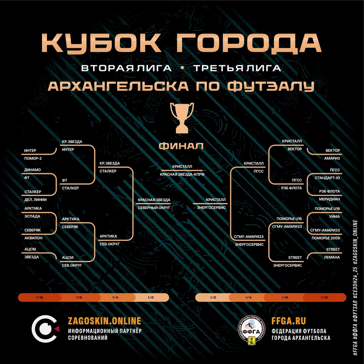 🔥 Кубок города Архангельска | 2Л | 3Л 26 апреля состоялись полуфинальные встречи Кубка города, за которыми вы могли наблюдать в прямом эфире. Красная Звезда-КПРФ принимала на своём паркете Северный Округ. Как и ожидалось, матч был жарким. Команды бились за каждый сантиметр площадки, о чём говорят и набранные фолы - 1:5 в первом тайме и 5:6 во втором. 24 минуты первого тайма на табло горели нули, но оставшиеся 6 минут первого тайма предрешили исход матча. Счёт в матче открыл Денис Давыдов. Затем меньше чем за минуту Денис Хомяков оформляет дубль, а под занавес первого тайма Сергей Федотов забивает четвёртый мяч в ворота Северного Округа выверенным ударом под перекладину. На первой минуте второго тайма Семён Рогушин открывает счёт голам Северного Округа и тем самым дарит надежду на камбэк. Но время неумолимо истекало. Пятый мяч в ворота сульфатской дружины забивает Сергей Федотов, а за 9 минут до конца Семён Рогушин оформляет дубль и тем самым устанавливает окончательный счёт в матч