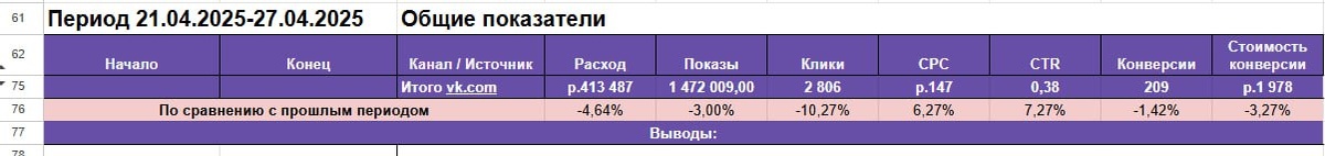 По сравнению с прошлым периодом Мы в начале каждой недели собираем статистику за прошлую неделю и подбиваем данные — сколько потрачено, какие показатели достигнуты, удается ли удерживать KPI и делаем выводы, чего нам не хватает и планируем следующий период. Получается такая табличка понедельная. И есть показатели, которые глобально не важны, но очень важны клиенту. Например, насколько улучшилась глубина просмотра сайта. Хотя наша цель — заявки. И вот в оглядке только на важные метрики не всегда анализировали ещё и этот показатель. А месяц назад в наши отчеты я добавила строку — по сравнению с прошлым периодом, где мы в процентах автоматически считаем, как и на сколько улучшились показатели и сразу же видно, за счет чего это произошло. И клиентам стало понятнее, особенно, кто очень любит таблички и статистику, и нам стало нагляднее, проще делать выводы уже во всех проектах. Сейчас мне это кажется таким очевидным, хотя месяц назад я думала «ого, и так можно делать».