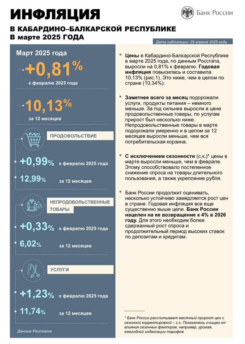 В марте цены в Кабардино-Балкарии выросли быстрее, чем в среднем по России – на 0,81%, достигнув годовой инфляции в 10,13%. Основной вклад в рост цен внесли продовольственные товары (особенно сыр) и непродовольственные – моющие средства, парфюмерия и медикаменты. Самый значительный скачок цен зафиксирован в сфере услуг: пассажирский транспорт (дороже стало ездить на маршрутке из-за роста топливных расходов и зарплат), организации культуры (повысился спрос на развлечения и выросли затраты театров) и санаторно-оздоровительные услуги/туризм (активизировался внутренний туризм, открылись направления в Турцию и Египет).