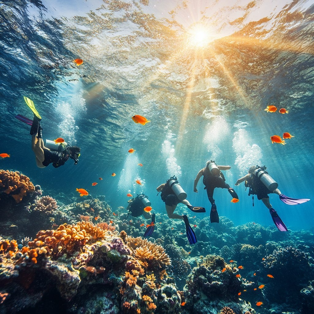 Создано на основе запроса: group of people scuba diving in clear turquoise Mediterranean water, vibrant coral reef, colorful tropical fish