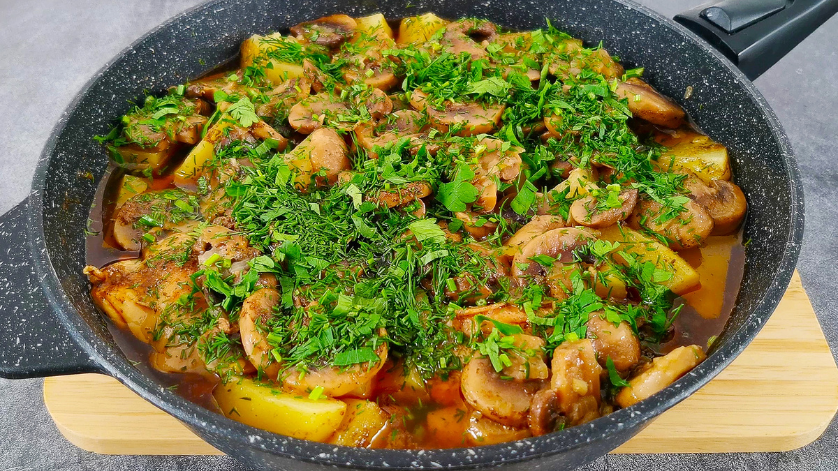 Курица с картофелем и грибами — это классическое блюдо, которое радует своим вкусом и ароматом. Оно прекрасно подходит как для ужина в кругу семьи, так и для праздничного стола. Сочетание обжаренного куриного мяса, мягкого картофеля и ароматных шампиньонов создает гармоничное сочетание, которое не оставит равнодушным никого. Итак, приступим. 1. Для приготовления этого блюда для начала приготовим грибы. В сковороду налить немного растительного масла, разогреть и добавить мелко нарезанный лук. Обжарить его на среднем огне до прозрачности, периодически помешивая. 2. Шампиньоны промыть в прохладной воде и нарезать небольшими кусочками. Когда лук станет прозрачными, добавляем грибы и жарим помешивая на среднем огне 10 минут. Затем посолить и готовить помешивая еще 10 минут. Как только грибы приготовятся, убираем их с плиты и отставляем в сторону. Они нам понадобятся позже. 3. В глубокую сковороду наливаем немного растительного масла. В масло добавляем зубчики чеснока, предварительно разреза
