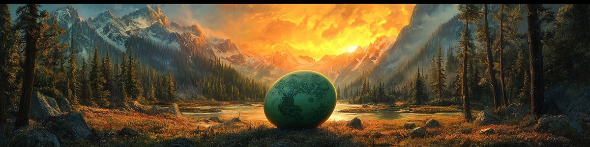 Создано на основе запроса: a gigantic green egg laying in a clearing of a huge, dense forest of Pine, Maple and Oak trees, a river winds its way through a distant valley, snow-capped mountain peaks partially hide a brilliant orange-yellow sunset happening behind fair-weather clouds, allowing bars of light to shine down into the valley below --- Автоперевод: Гигантское зеленое яйцо, лежащее на очистке огромного, густого леса из сосны, клена и дубов, река пробирается через далекую долину, снежные горные вершины частично скрывают блестящий оранжево-желтый закат, происходящий за светло-погодой, позволяя бару с светом, чтобы сиять в долине внизу. Какое твое впечатление? 🤔 https://dzen.ru/id/65c0c65c86e4f837c27b24d7 #ИИ #AI #нейросеть #midjourney #art
