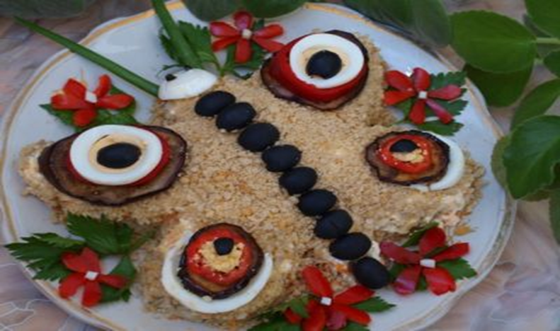 Ингредиенты: Картофель — 3 шт. Морковка сырая — 1 шт.(большая) Яйца — 3 шт. Свинина — 150–200 г Баклажаны — 4 кружочка Красный сладкий перец — 0,5 шт. Маслины — примерно 10 шт. Сухарики (вкус "сметана, зелень") Зеленый лук, укроп Чеснок — по вкусу Майонез — 500 г Подготовка слоев Отварить кусочек свинины и яйца до готовности. Натереть весь картофель, 2/3 морковки и 2 яйца на крупную терку. Свинину порезать небольшим кубиком. Кружочки баклажан обжарить на растительном масле. Сделать соус из давленного чеснока и майонеза. Сухарики измельчить с помощью блендера или терки. Выкладывание слоев. По желание, можно сформировать салат в виде бабочки или использовать специальное разъемное кольцо, выстланное изнутри пергаментной бумагой или специальной плотной пленкой. Форму устанавливаем на плоское блюдо и выкладываем салатные уровни: 1. Слой №1: тертый картофель, смазанный соусом из майонеза и чеснока. 2. Слой №2: нарезанная свинина с соусом и чесноком. 3. Слой №3: тертая морковь + соус. 4. Слой
