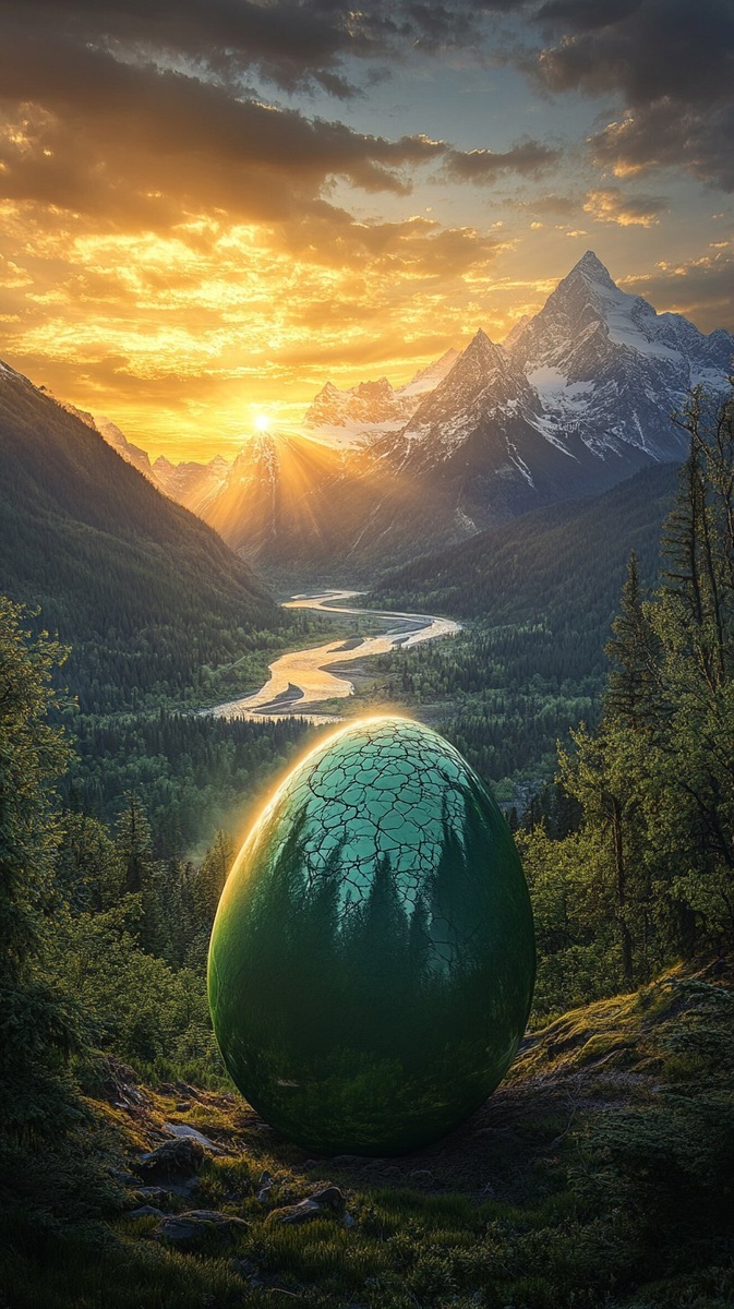 Создано на основе запроса: a gigantic green egg laying in a clearing of a huge, dense forest of Pine, Maple and Oak trees, the egg and clearing should appear on the bottom of the picture, a river winds its way through a distant valley, snow-capped mountain peaks partially hide a brilliant orange-yellow sunset happening behind fair-weather clouds, allowing bars of light to shine down into the valley below --- Автоперевод: Гигантское зеленое яйцо, лежащее на расчистке огромного, густого леса из сосны, клена и дубов, яйцо и очистка должны появляться на дне картины, река проходит через далекую долину, снежные горные вершины, частично скрывают блестящий оранжевый-желтый солнце, происходящий за светло-погодой, позволяя стволо Какое твое мнение? 🤔 https://dzen.ru/id/65c0c65c86e4f837c27b24d7 #ИИ #AI #нейросеть #midjourney #art