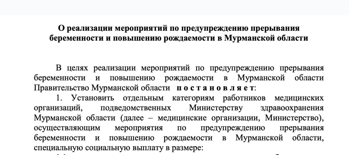 Медицинских работников в Мурманской области, сумевших отговорить женщин от пребывания беременности (от абортов), будут поощрять. Соответствующее постановление появилось на сайте «Открытый регион». Согласно тексту документа, если женщину отговорили от аборта на сроке до 12 недель, младший медперсонал получит пять тысяч рублей. Если это сделает специалист более высокой квалификации – 25 тысяч рублей. В постановлении также отмечается, что антиаббортная премия носит социальный характер, не относится к оплате труда, и не учитывается при исчислении среднего заработка. Предполагается, что данное постановление будет действовать до конца 2025 года. Источник финансирования этих выплат в постановление не указан, но скорее всего они будут производиться за счёт областного бюджета. ❄ «Арктический Обозреватель»