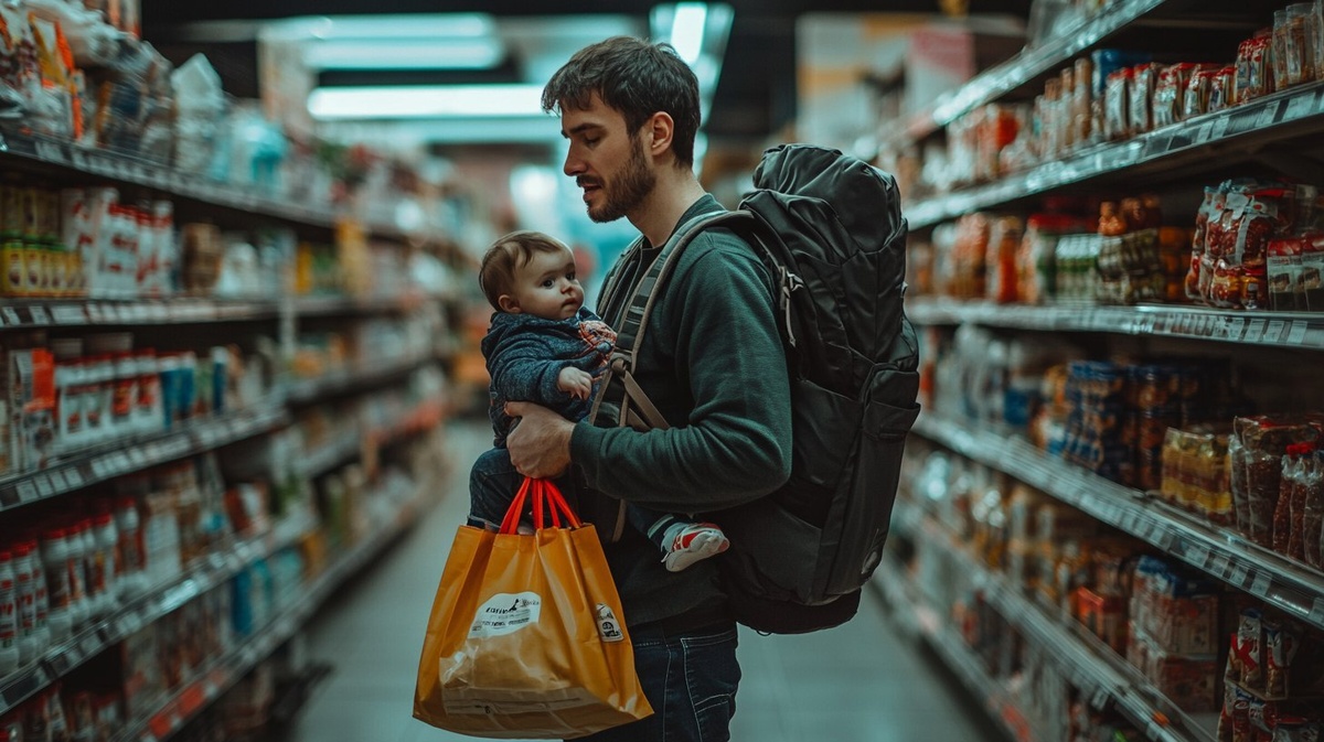 Создано на основе запроса: cinematic still, wide shot, full body shot, Tired father with baby in a carrier, grocery shopping in a