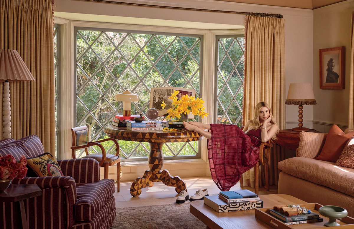 Дом Эммы Робертс находится в Лос-Анджелесе, но вовсе не похож на гламурный особняк. Интерьер создан по дизайну архитектурного бюро Pierce & Ward в английском винтажном стиле. Здесь можно найти и колониальные мотивы, и личную коллекцию кукол актрисы, а также произведения искусства и коллекционные издания книг. Эмма живет здесь с мужем и маленьким сыном Роудсом. Все члены семьи обожают этот дом, который олицетворяет традиционные ценности, любовь к природе и натуральным материалам. Центральное место занимают удобные диваны с обивкой из роскошных тканей, таких как бархат или лен. Стены украшены произведениями искусства, часто в стиле середины XX века. Винтажные ковры и деревянные элементы мебели добавляют интерьеру глубины. Использование природного камня и латуни в отделке можно найти в ванной комнате. Двойные шторы и скульптуры на каменной столешнице придают помещению характерность и изысканность. На полу — мозаика из красного натурального камня. В детской кровать сына оформлена жаккардо
