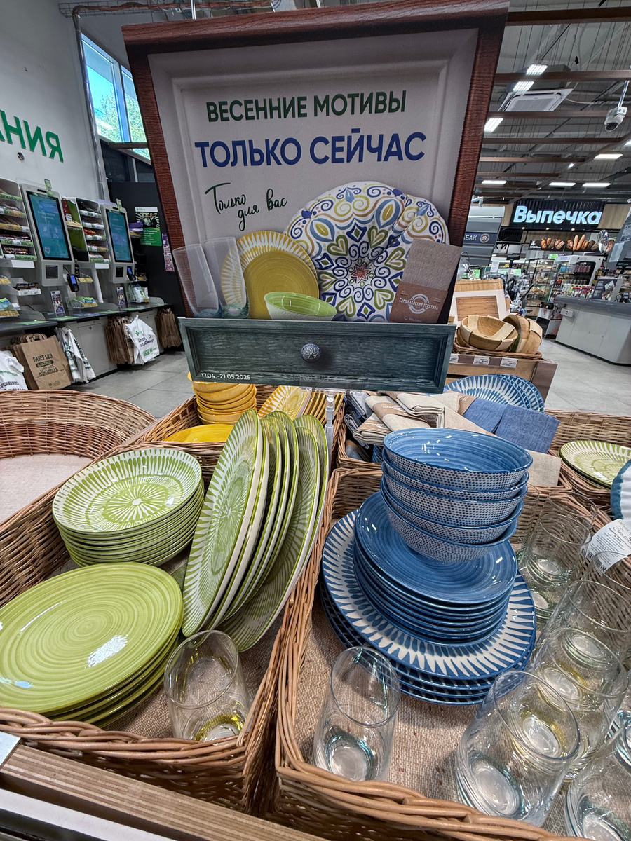 Сразу на входе меня встречает настоящий островок счастья — яркая коллекция фарфоровой посуды! А знаете, как она называется? Весенние мотивы! Просто загляденье, правда?