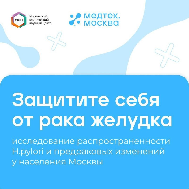 🔵 Как сохранить здоровье желудка МКНЦ им. А.С. Логинова и Медтех приглашают принять участие в научном исследовании, посвящённом распространённости Helicobacter pylori и предраковых изменений желудка. Ваше участие поможет получить важные научные данные и разработать более эффективные подходы к ранней диагностике и профилактике заболеваний желудка. В рамках исследования вы бесплатно пройдёте обследование у московских врачей на наличие Helicobacter pylori – в случае выявления инфекции вам будет предложено дополнительное углублённое обследование. Кто может принять участие в исследовании: 🔵 Мужчины в возрасте от 30 до 49 лет и от 55 до 79 лет 🔵 Женщины в возрасте от 18 до 19 лет и от 75 до 79 лет Условия участия: - Москвичи и жители Московской области, прикреплённые к московским поликлиникам - Отсутствие в анамнезе лечения инфекции Helicobacter pylori Как записаться: - Для участия необходимо заполнить онлайн-форму - После отправки формы с вами свяжется куратор исследования из МКНЦ