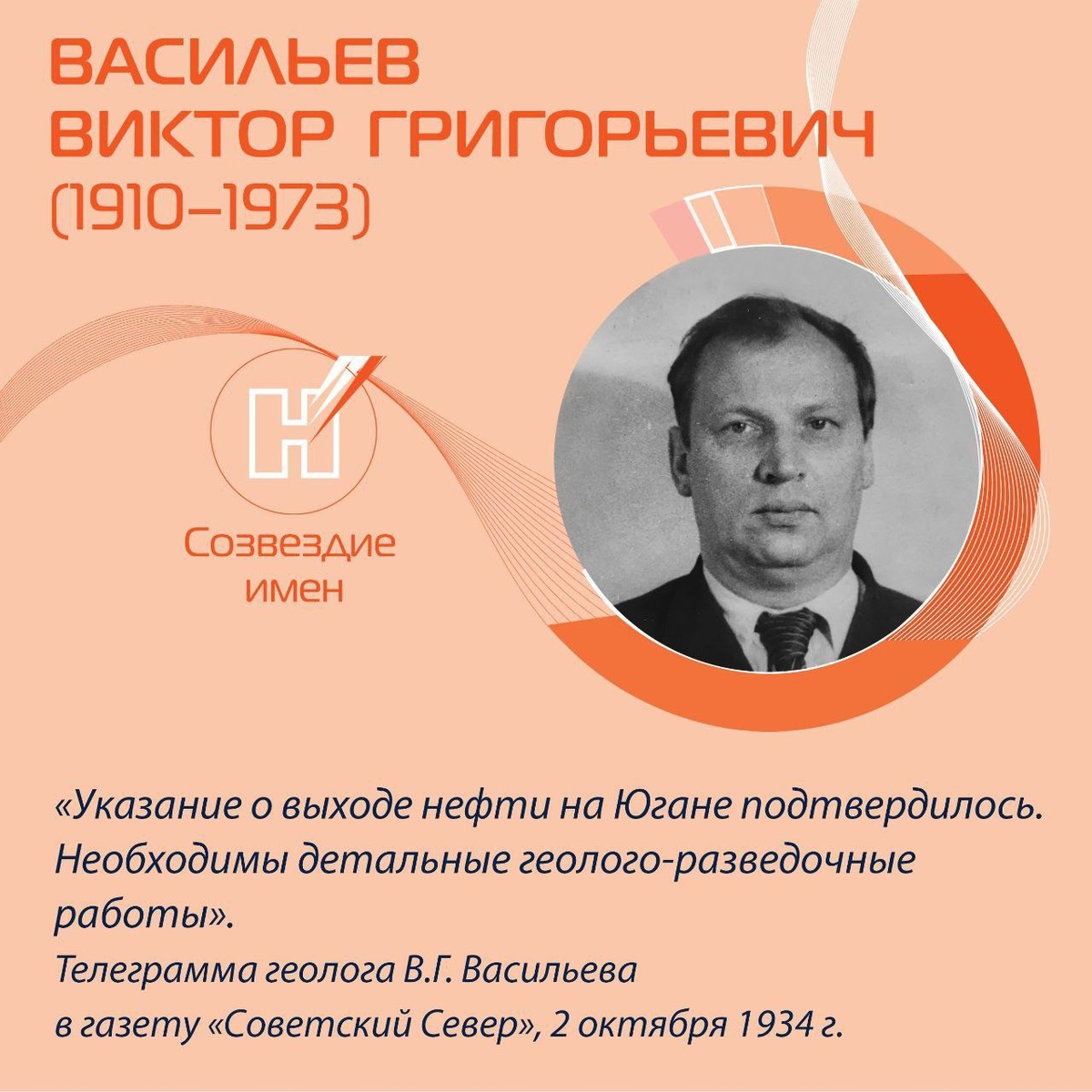 28 апреля 1910 г. родился геолог Виктор Григорьевич Васильев, один из пионеров западно-сибирской нефти. Уроженец г. Череповца, сын рабочего. В 1934 г. окончил Московский нефтяной институт, инженер-геолог по разведке нефтяных и газовых месторождений. Был направлен в трест "Востокнефть", где сразу же получил назначение - возглавить геологическую партию для проверки сведений о нефтеносности в Тавдинском и Сургутском районах Остяко-Вогульского округа. В 1934 – 1937 гг. – начальник геологических экспедиций треста Востокнефть. В 1934 - 1935 гг. руководил Обь-Иртышской нефтеразведочной экспедицией, подтвердившей выходы нефти на р. Большой Юган в районе г. Сургута. В 1937 – 1941 гг. – директор ЦНИЛ треста Востокнефть, а после реорганизации - треста «Сызраньнефть». В 1941 – 1942 – директор и главный геолог НГРИ (г. Куйбышев). В 1942 – 1943 гг. – старший геолог, директор ЦНИЛ Куйбышевнефтекомбината. В 1943 - 1947 гг. – управляющий трестом «Союзгазразведка» (г. Москва). С 1947 по ноябрь 19