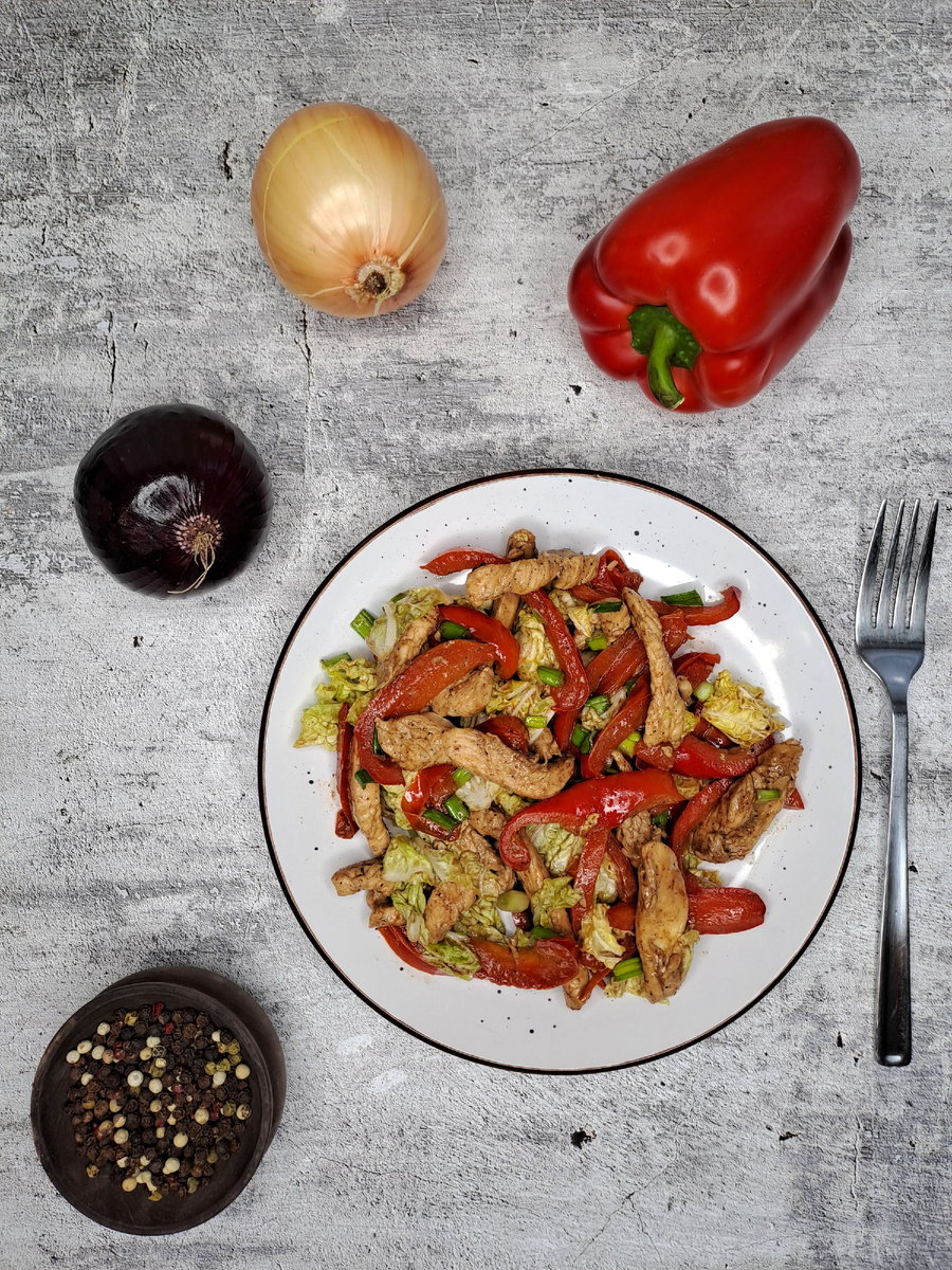 Для приготовления салата нам потребуются следующие ингредиенты ● Куринная грудка 1 шт. ● Болгарский перец 2 шт. ● Китайская капуста 0.5 кочана ● Соевый соус 50 мл. ● Черный перец 0.25 ч.л. без горки Приготовление 1. Делим куриную грудку на 2 части и нарезаем полосками. Перец так же нарезаем полосками 2. Обжариваем слегка куриную грудку и добавляем к ней болгарский перец. Жарим до мягкости перца 3. Добавляем соевый соус, черный перец и обжариваем примерно 3 минуты 4. Нарезаем капусту, добавляем к ней перец и курицу. Хорошо перемешиваем Получается вкусно и главное готовится очень быстро! Приятного аппетита!