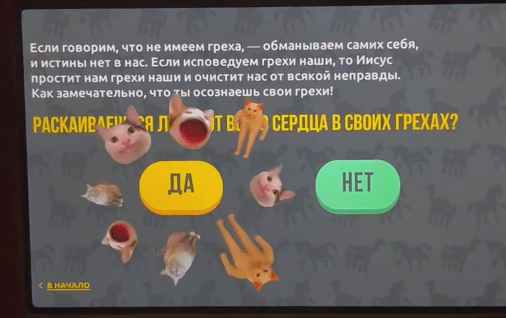 В церкви Анненкирхе в Санкт-Петербурге временно установили терминал для «диагностики грехов». Среди них — «воровал канцелярию с работы», «говорил "господибожемой" вместо "ёпрст"», «не отдавал долги», «верил в карты таро». Если «раскаяться», на экране появятся мемные коты. В соцсетях шутят, что это «индульгенция в киберпанк-версии» vc.ru/marketing/1955393