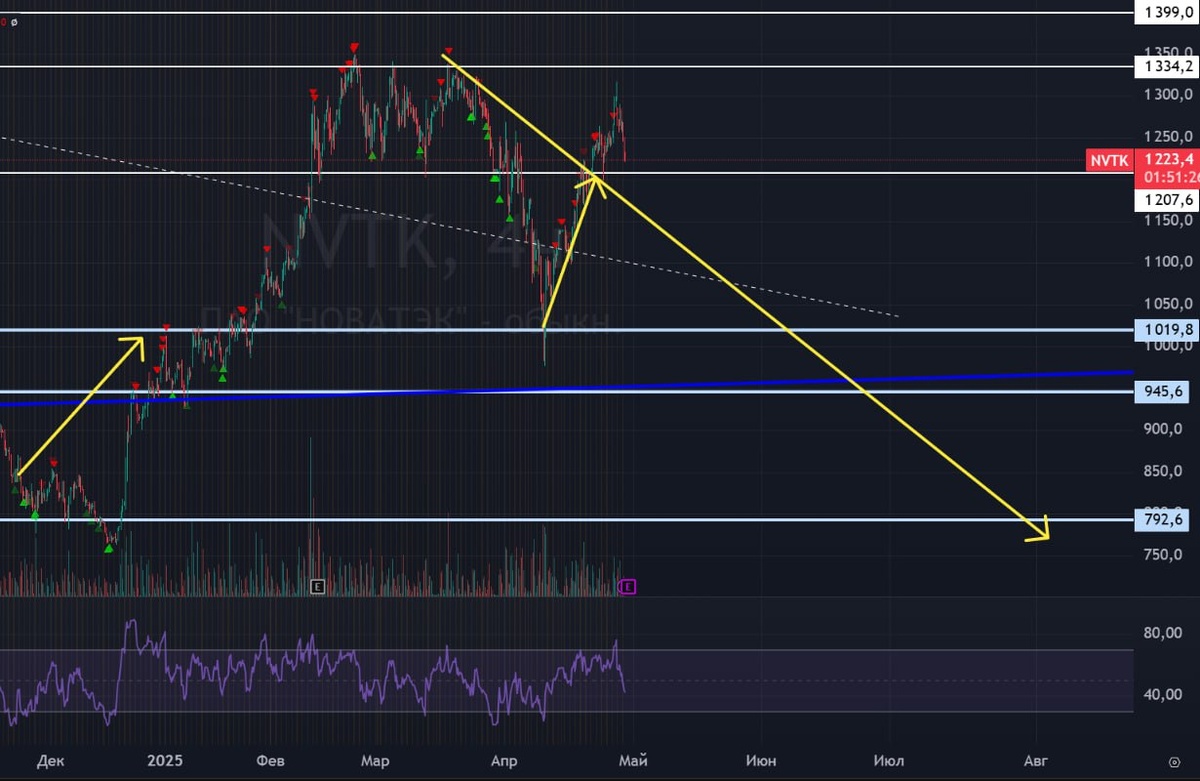 🔋 #Новатэк #NVTK РСБУ 1к2025 Чистый убыток 35.3 млрд руб (против прибыли в 65.1 млрд руб годом ранее) 🟢 Эта акция удивительным образом ходит. То она сильнее рынка. когда была на хаях, потом она была слабее рынка на коррекции. Когда на рынке был отскок от Дна №3, то она снова показывала сильную динамику роста, а перед див.отсечкой летала на 5,5% вверх. Не понятно теперь что от нее ждать - сильной слабости после отчета или силы? Слишком странная акция в своей динамике.