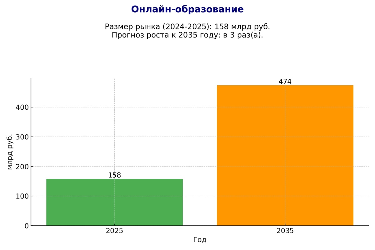 - Прогноз до 2035 (оптимистичный): Ожидается сохранение двузначных темпов роста, хотя после периода пандемийного бума они несколько замедлились (рост ~19% в 2024-м)smartranking.ru. Онлайн-образование будет масштабироваться за счет новых технологий (нейросети для персонализации обучения и пр.) и вовлечения широкой аудитории. По оценкам экспертов, глобально EdTech-рынок может расти ~34% в год, и хотя в России темпы могут быть чуть скромнее, за 10 лет рынок способен вырасти в несколько раз. В оптимистичном сценарии к 2035 году объем российского онлайн-образования может превысить 500–600 млрд руб., а онлайн-обучение станет привычным для значительной части населения.