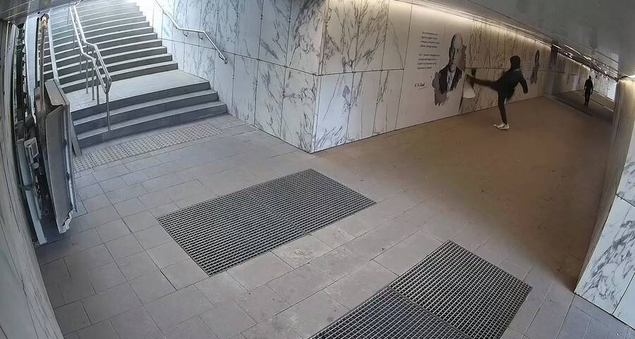 Камеры видеонаблюдения зафиксировали, как молодой человек разбивает ногой настенную плитку.