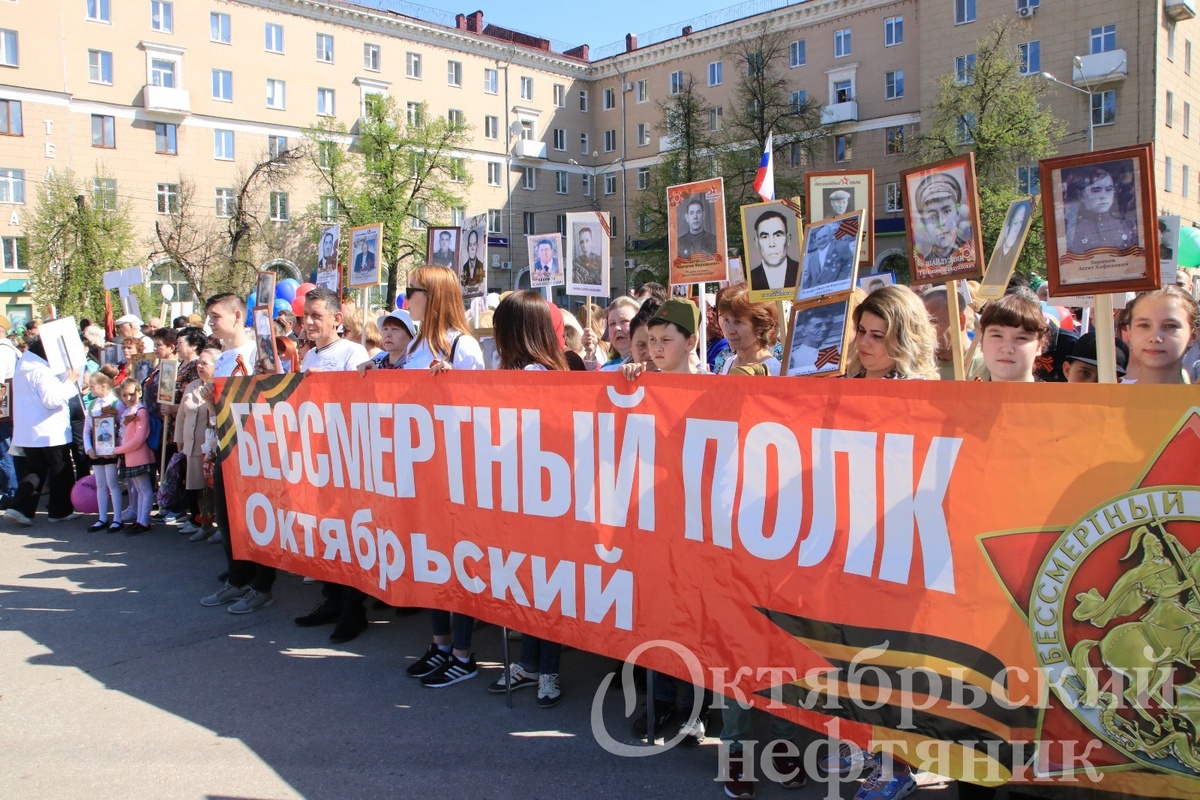 Общероссийская гражданско-патриотическая акция «Бессмертный полк» пройдёт в Октябрьском в традиционном формате: шествием по площади имени В. Ленина, по улице Социалистической до мемориала «Думы солдата». Сбор участников «Бессмертного полка» — 9 мая, в 09.30, на городской площади. Перед началом шествия участники споют песню «Катюша» на русском и башкирском языках. Затем наступит общереспубликанская «Минута молчания». Принять участие в акции может каждый, кто чтит память родных — участников Великой Отечественной войны, детей войны, военнослужащих, погибших при исполнении воинского долга. Транспаранты для участия в акции можно заказать в городской типографии. На сайте акции с помощью онлайн-конструктора предлагают создать плакат с изображением фронтовика.