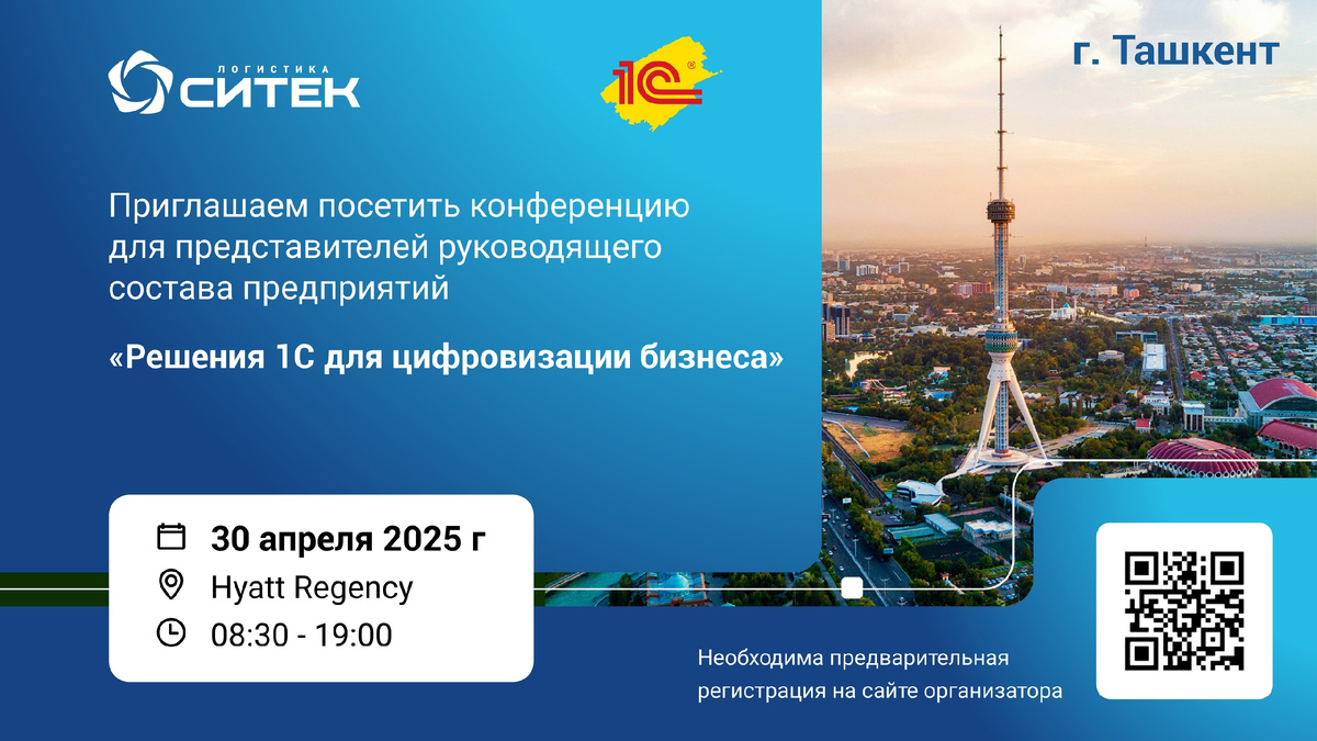 🏢 Организаторы: фирма «1С» и ее дистрибьюторы в Узбекистане «VENKON» и «1S-Toshkent». 📉 Мероприятие: конференция «Решения 1С для цифровизации бизнеса». 🗓 Когда: 30 апреля 2025. 📍 Где: Ташкент. Цель конференции - информирование участников о возможностях современных решений для цифровизации бизнеса на платформе «1С:Предприятие 8», обмен опытом по проектам внедрения и решениям «1С» для корпоративного сектора, отраслевых и специализированных решений для промышленности, сельского хозяйства, транспорта и логистики. Специалисты СИТЕК в рамках отраслевой секции «Логистика и транспорт» расскажут о том, как увеличить эффективность работы склада в два раза на реальных примерах. Конференция будет проходить в отеле «Hyatt Regency Tashkent» по адресу: Ташкент, ул. Алишера Навои, д. 1А. До встречи на конференции!