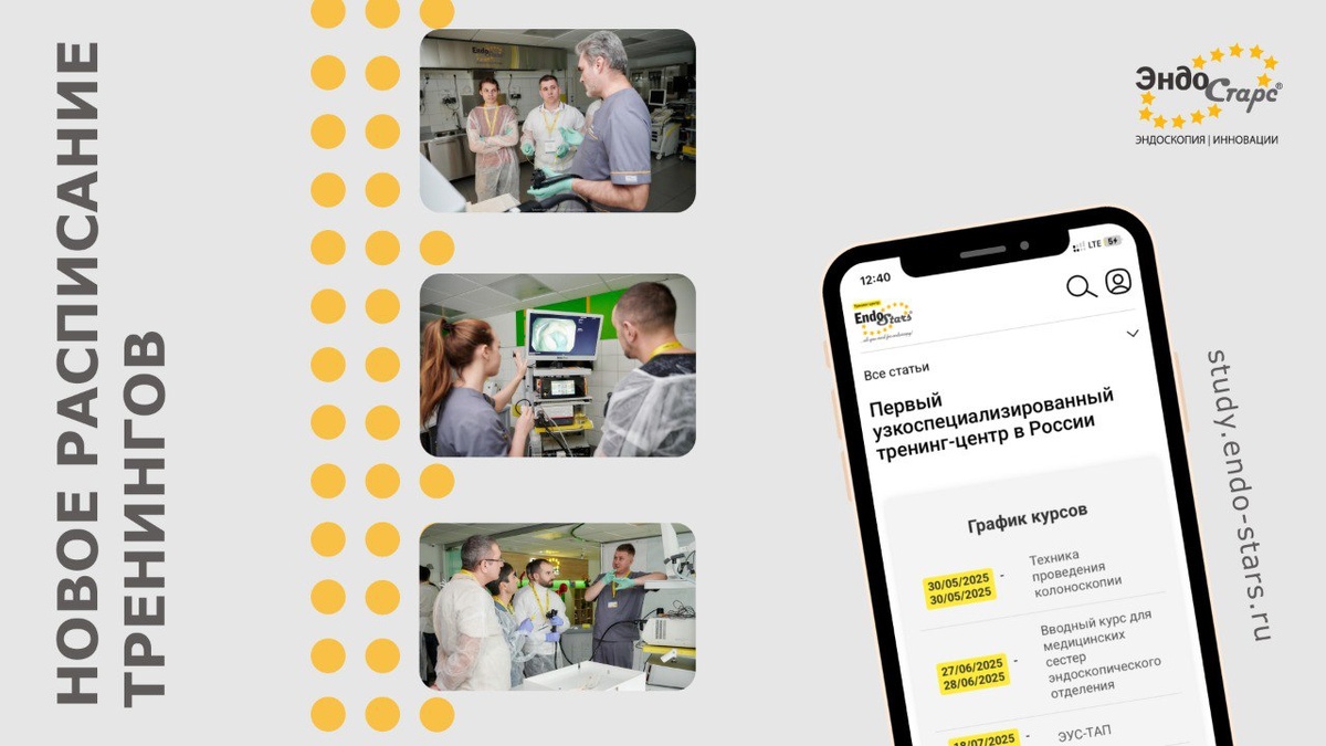 Уважаемые коллеги, ⚕Анонсируем новое расписание курсов тренинг центра «Эндо Старс». Летом 2025 года планируется проведение трех курсов для врачей-эндоскопистов и один для медицинских сестер. Расписание курсов: 🔸30 мая — «Техника проведения колоноскопии» 🔸27-28 июня — «Вводный курс для медицинских сестер эндоскопического отделения» 🔸18-19 июля — «ЭУС РХПГ» 🔸29-30 августа — «ЭУС ТАП» 📲Для записи заполните форму на сайте тренинг центра «Эндо Старс» ‼️Регистрация откроется в понедельник, 5 мая, в 10:00 по московскому времени. Запись на курсы происходит в режиме живой очереди — место для прохождения курса будет предложено участникам, которые подали заявку раньше. В случае отказа участника, место будет предложено следующему по временной отметке. До встречи на обучении! #эндо_старс_тренинг_центр Всегда Ваши, Эндо Старс🌟