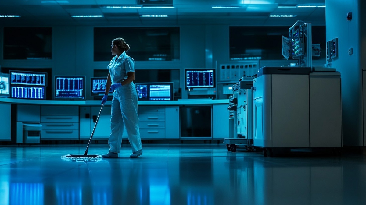 Создано на основе запроса: cinematic still, a middle aged cleaning Lady in simple cleaning uniform, mops the Floor in an modern empty bureau