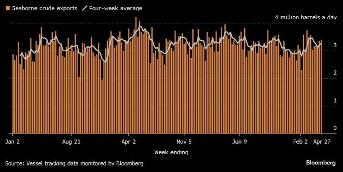 Подсанкционные танкеры месяц простаивали, но теперь они возвращаются к работе. Экспорт российской нефти растет вторую неделю подряд: почти половина танкеров, подпавших под санкции в предыдущие годы, теперь снова перевозят российскую нефть. Объем морских поставок сырой нефти из всех российских портов вырос до 3,26 млн баррелей в день за четыре недели до 27 апреля, что на 1% больше, чем на предыдущей неделе. Объемы поставок составляют примерно 190 000 баррелей в день, что 6%, ниже недавнего пика, наблюдавшегося месяц назад. Рост объемов перевозок из портов Балтийского и Тихоокеанского регионов был в значительной степени компенсирован сокращением поставок из Черного моря и Арктики. Морские поставки сырой нефти из России Источник: Bloomberg Администрация президента США Дональда Трампа пока воздерживается от введения дополнительных санкций против России, и несколько танкеров, санкционированных президентом Джо Байденом, возобновили перевозку российской сырой нефти. По крайней мере, 18 из 39