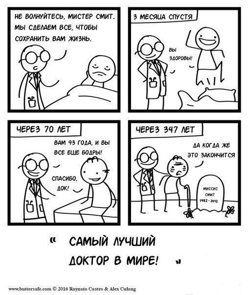 Собирая материал, задумался: почему-то ещё в детстве мне особенно нравились анекдоты и шутки про врачей, а теперь вот комиксы на эту тему тоже веселят меня больше прочих. Казалось бы! Врачи, болезни, больницы – всё это отнюдь не весело, скорее мрачно и печально. Да и я не сказать, что прям любитель чёрного юмора. Наверное, это связано с тем, что юмор вообще частно строится на каком-то отклонении от нормы. То есть люди смеются на чем-то необычным, что отходит от понятия нормального. С этой точки зрения тема врачей и болезней открывает широкие возможности для полёта фантазии и придумывания комичных ситуаций.