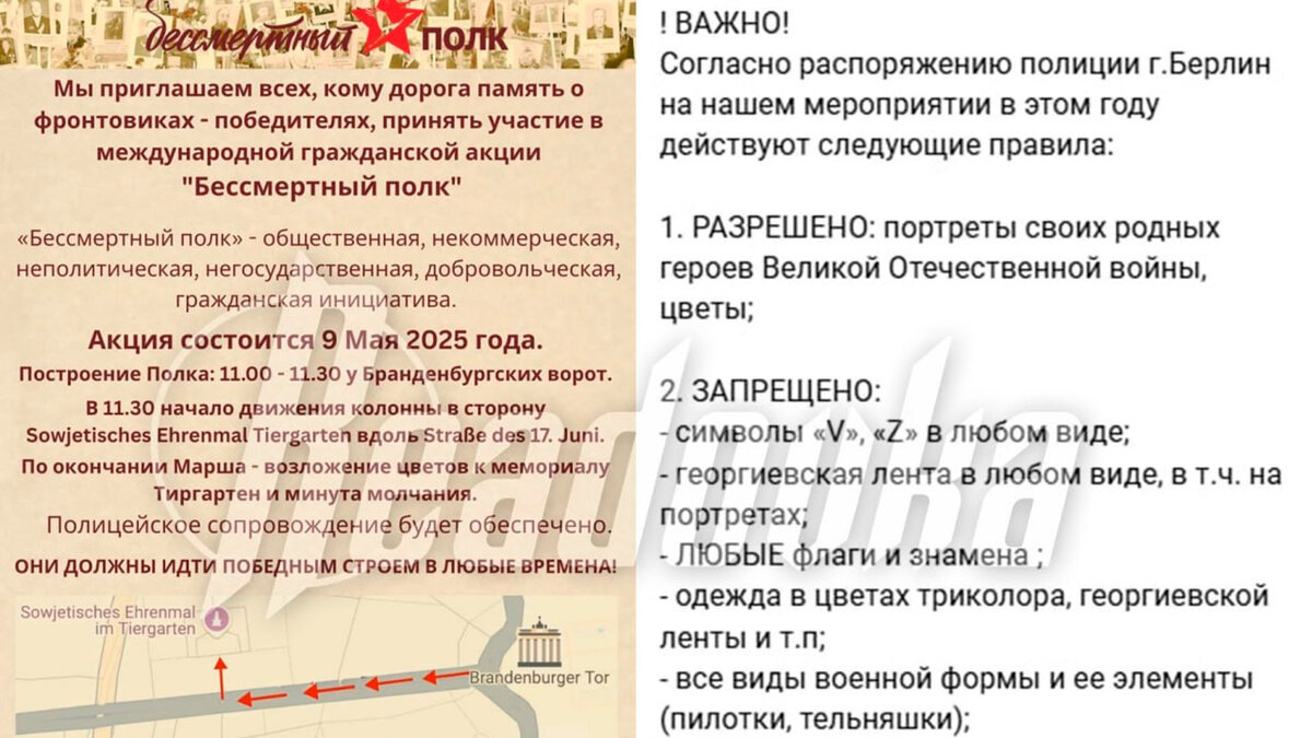 Под санкции также попали и другие символы Великой Победы. По рекомендации властей полиция Берлина запретила приносить на ежегодную акцию «Бессмертный полк» георгиевские ленты и другую символику Победы 9 мая. Об этом сообщили организаторы мероприятия из числа русских активистов. Запрет также ввели на любые предметы в цветах российского флага, элементы военной формы и соответствующее музыкальное сопровождение. Помимо этого, мероприятие будет сопровождаться сотрудниками полиции в целях соблюдения правопорядка в городе. Если участники акции будут следовать всем условиям, то праздничное шествие тронется от Бранденбургских ворот. Однако, как считают организаторы, полиция может ввести еще какой-нибудь запрет в процессе мероприятия. Ранее официальный представитель МИД РФ Мария Захарова назвала отказ Германии звать россиян на День Победы вопиющим оскорблением. По ее словам, некоторые немецкие чиновники следуют идеям нацистов.