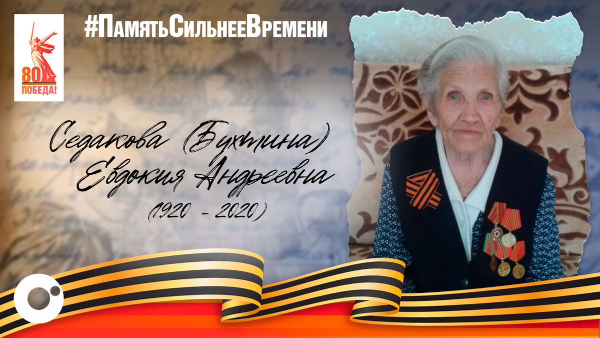 Евдокия Андреевна в годы войны труд проводника на железной дороге успевала совмещать с работой в колхозе, а позже окончила ещё и курсы радистов. О своей бабушке в рамках акции «Память сильнее времени» рассказал Марков Дмитрий. На фотографии моя бабушка, Седакова (Бухтина) Евдокия Андреевна, труженица тыла в годы Великой Отечественной войны и ветеран труда. Трудолюбивая и добродушная женщина. Родилась 3 марта 1920 года в Алтайском крае, селе Гилёв Лог.
