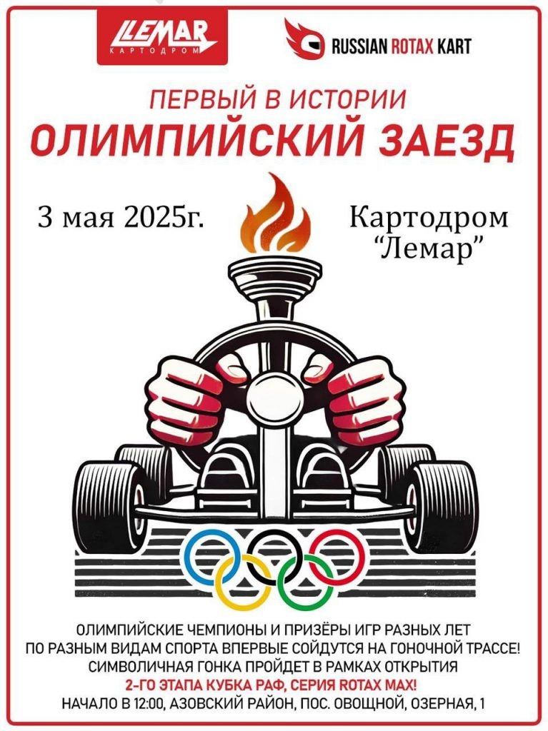 3 мая 2025 года в Ростовской области состоится знаковое событие — «Олимпийский заезд». Впервые победители и призёры Олимпиад различных лет из разных спортивных дисциплин соберутся на гоночной трассе, чтобы продемонстрировать свои навыки в скоростных гонках на картах. Участниками символичного соревнования станут атлеты, представляющие фехтование, спортивную гимнастику, греко-римскую борьбу, академическую греблю, греблю на байдарках и каноэ, стрельбу из лука, дзюдо, тхэквондо, гандбол и тяжёлую атлетику. Среди пилотов будет и медалист Олимпийских игр 1980 года в Москве! Мероприятие пройдёт в рамках церемонии открытия второго этапа Всероссийских соревнований по картингу — Кубка и Первенства Российской Автомобильной Федерации, серии Ротакс Макс 2025 года. Гонка состоится на территории картодрома «Лемар», расположенного по адресу: Ростовская область, Азовский район, посёлок Овощной, ул. Озёрная, 1. Олимпийцам окажут поддержку профессиональные гонщики — участники Кубка РАФ Ротакс Макс, котор