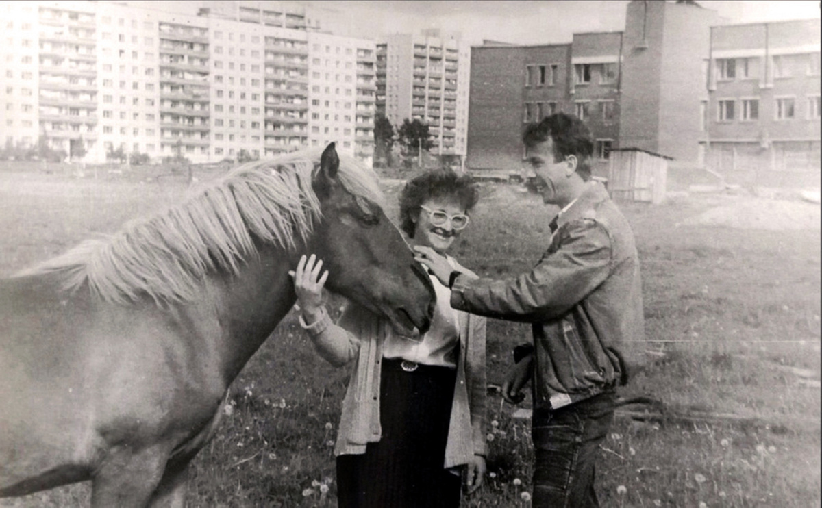 1990 год. Общение с лошадкой на пустыре перед строящимся зданием ДК ПЗ. Сейчас здесь площадь Федулова.