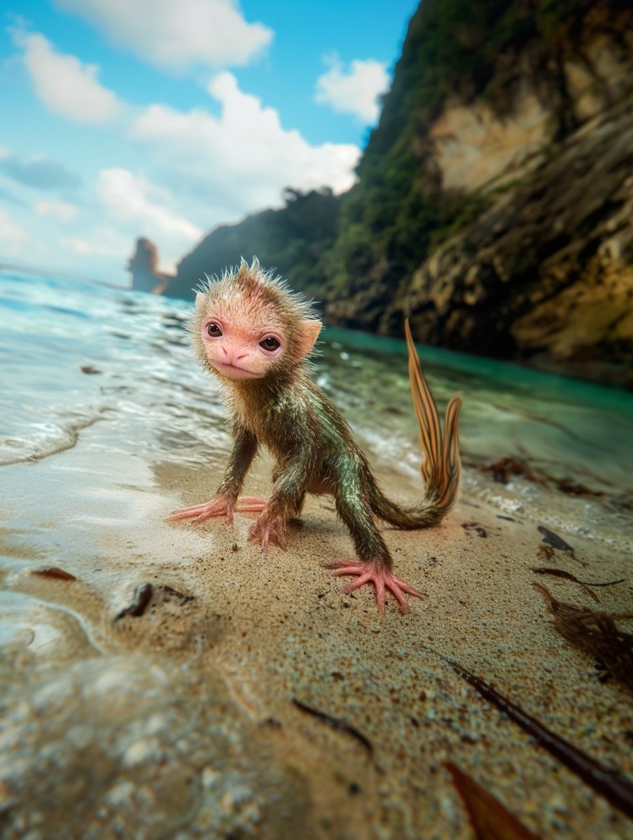 Создано на основе запроса: a photograph of a sea monkey, an amphibious mammal with pink and green skin and brown fur that lives half underwater and half on land. The sea monkey has a furry flat tail shaped like a fish tail. It has gills on its rib cage. It has brown furry feet with pink toes. The sea monkey is standing on a beach of a tropical island at the edge of the ocean. The island has a jungle and a mountain in the distance. --- Автоперевод: Фотография морской обезьяны, амфибийного млекопитающего с розовой и зеленой кожей и коричневым мехом, который живет наполовину под водой и наполовину на суше. Классно получилось? 🤔 https://dzen.ru/id/65c0c65c86e4f837c27b24d7 #ИИ #AI #нейросеть #midjourney #art