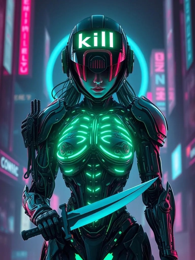 А вот за таких женщин не банят. Культа насилия и убийства не усматривают))) atmospheric, glossy digital art, minimalism. brutal biomechanical female character in exoskeleton with emerald iron ribs has blade in her hand in helmet with holographic title "kill" on helmet, stands in combat pose. front view. future city, neon holograms, cyberpunk, through the void, deep sensual, future ambient downtempo, Biomechanics, science fiction, high detail, high precision, aesthetically pleasing, beautiful, realistic, 4k, high resolution, ISO 800, bright lighting. 3D, 16K. #neuroart #нейроарт #ai #ии #нейросеть #картинки #искусственныйинтеллект #цифровоеискусство #digitalart #арт #art #prompt #промпт #подсказка