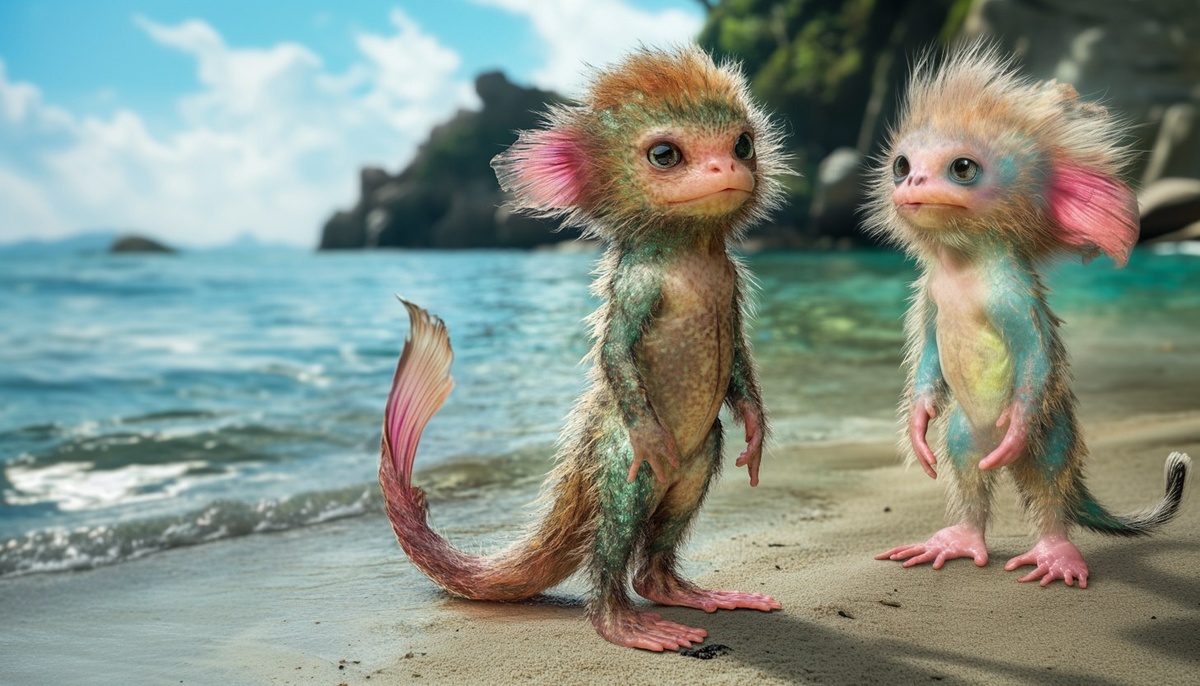 Создано на основе запроса: 5 more sea monkeys, an amphibious mammal with pink and green skin and brown fur that lives half underwater and half on land. The sea monkeys have furry flat tails shaped like fish tails. They have gills on their rib cage. They have brown furry feet with pink toes. The sea monkeys are standing on a beach of a tropical island at the edge of the ocean. The island has a jungle and a mountain in the distance. --- Автоперевод: Еще 5 морских обезьян, амфибийное млекопитающее с розовой и зеленой кожей и коричневым мехом, которое живет наполовину под водой и наполовину на суше. Отлично получилось? 🤔 https://dzen.ru/id/65c0c65c86e4f837c27b24d7 #ИИ #AI #нейросеть #midjourney #art