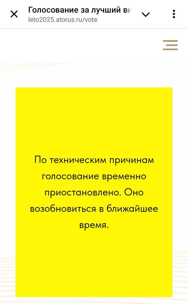 ❗Внимание: хакерская атака на страницу народного онлайн-голосования в номинации «Визуальный креатив года» Кибератака на платформу для голосования происходит в данный момент. Для защиты целостности процесса и обеспечения достоверности результатов мы временно отключили функцию голосования. Технические специалисты работают над нейтрализацией угрозы, и сервис будет восстановлен сразу после устранения всех рисков. Благодарим за понимание! @atorus